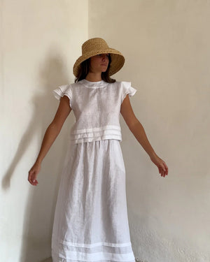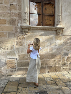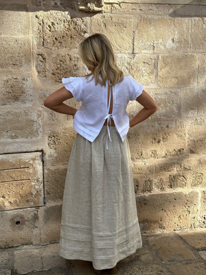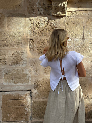 Blusen Camila er en let cropped top med åben ryg og justerbare stropper for en mere behagelig pasform. Den er fremstillet af 100% hør. Flæsedetaljer på ærmerne giver et feminint touch. Perfekt til din hverdagssommergarderobe.