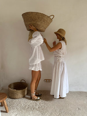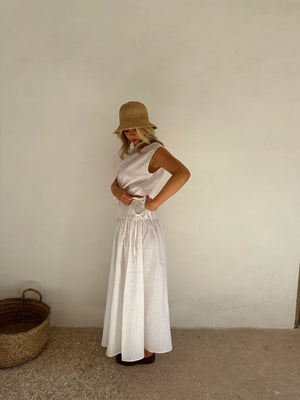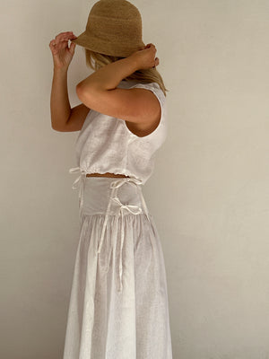 Den hvide Katie-nederdel har en elegant A-formet silhuet og høj talje for en flatterende pasform. Den er fremstillet af 100% hør og passer perfekt til Top Camilla for et elegant og tidløst look. Et alsidigt stykke tøj til enhver lejlighed.